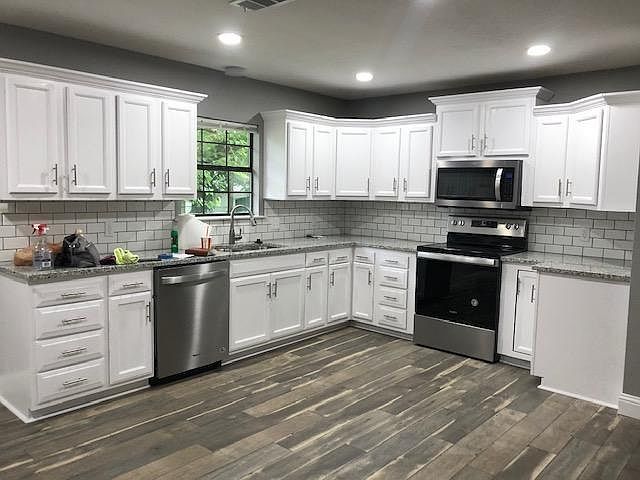 Beautiful Corner Homesite for this freshly remodeled home. Spacious floorpan great for entertaining or relaxing to your hearts content. Updates include electrical, plumbing, flooring, Kitchen fully remodeled, granite countertops, Subway tile styled backsplash, fresh cabinets, flooring, stainless appliances. Both Bathrooms fully re done with granite countertops. This home shines with all its updates. Rear covered patio overlooking huge yard. Oversize One car garage has builtin shelves for workshop and additional storage space for yard equipment or whatever you want. Includes fridge with accepted offer.