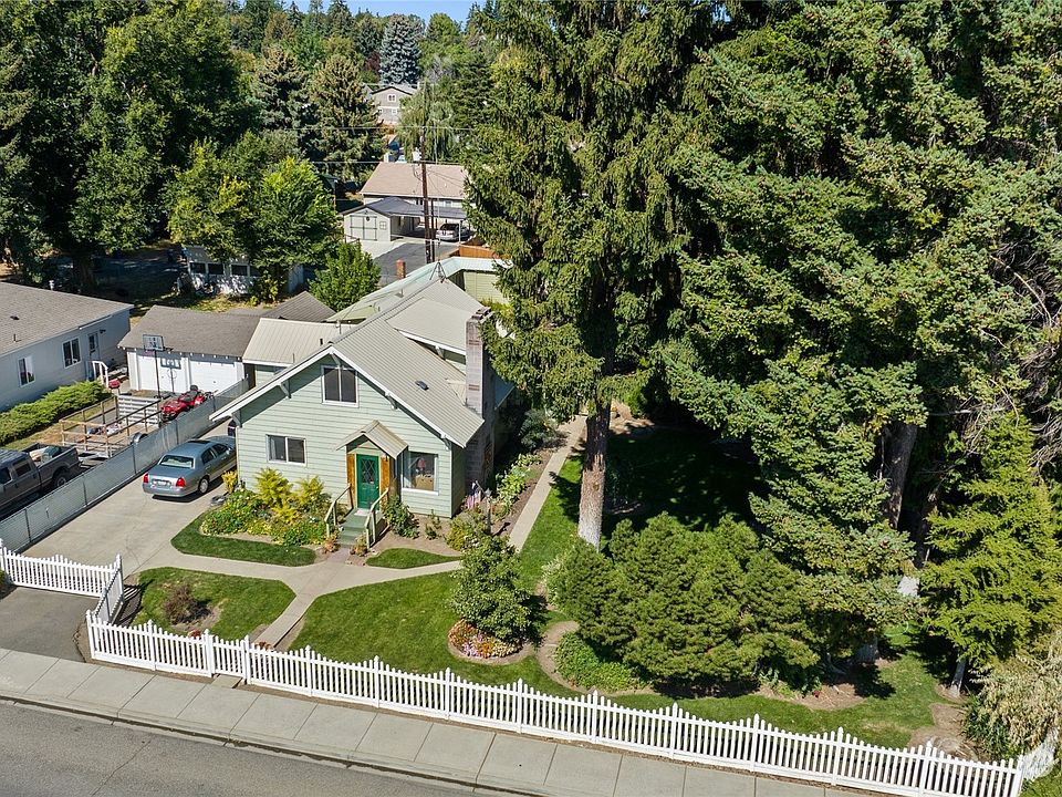 Welcome to this charming home nestled in a prime location! Situated on a large lot, this home offers tranquility & privacy with its lush trees & delightful fruit trees. Step outside onto the covered patio, perfect for outdoor gatherings & relaxation. Inside, you'll find a cozy yet spacious interior featuring 2 bedrooms & 2 bathrooms. Roomy enclosed porch with new flooring is a perfect for enjoying your morning coffee. Convenience is key with an attached garage & a detached storage building with a shop area for your hobbies. Alley access adds practicality, & the prime location puts you close to all amenities, making this property an exceptional find. Two tax parcels. Don't miss the opportunity to call this place home!