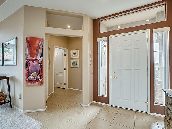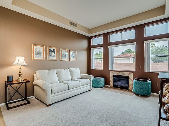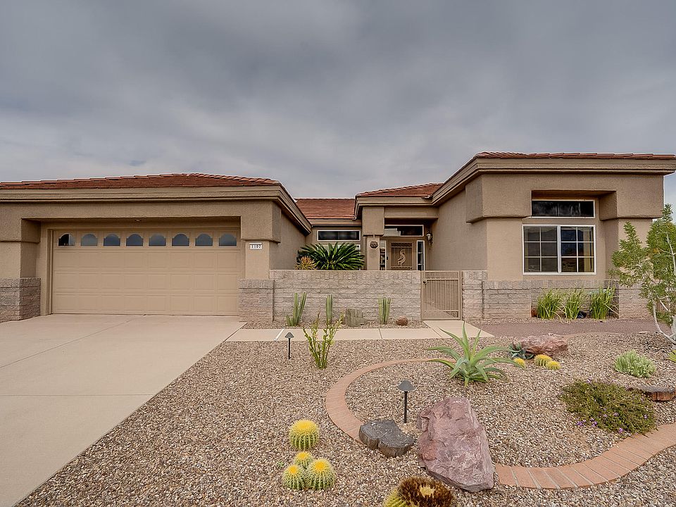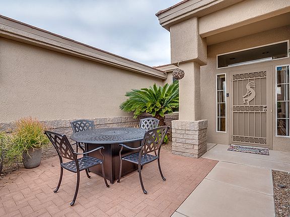 Fabulous Sun City home on a premium corner lot with a wonderful front courtyard. This Hampton floor plan offers privacy with a split floor plan & each bedroom has its own bathroom. The kitchen opens to the living room and offers tons of cabinet space. The home features a living room w/fireplace, dining area, family room & eat-in breakfast area. Master suite has a large bedroom & walk-in closet. Master bath has separate tub/shower. Laundry Room has utility sink & cabinets and the garage has golf car space. The nicely landscaped yard boasts mountain views, extended patio & beautiful plantings that will make your outdoor living special. This home has been meticulously maintained. Enjoy all the Sun City amenities!
