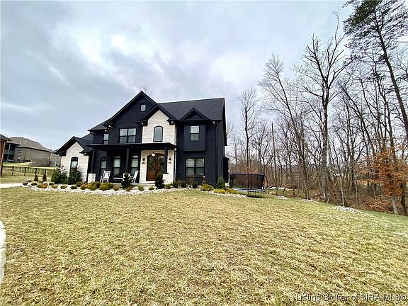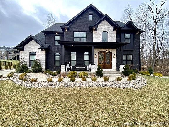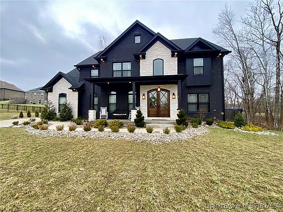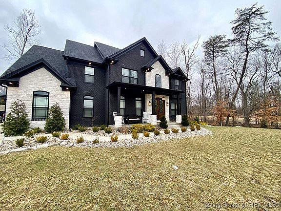 Listed below appraised value! Welcome to the "Gentry," all black brick and white stone CUSTOM BUILT HOME with THREE CAR GARAGE! Safe cul de sac living. Enjoy resort style living at the COVERED BRIDGE GOLF COMMUNITY featuring 18 holes, clubhouse, restaurant/bar, swimming pool/fitness center. Stately design and colonial porch with double MAHOGANY WOOD front doors! 20 foot soaring ceilings, grand foyer with office/den, formal dining room, TWO STORY LIVING ROOM, wainscoting and two piece crown molding throughout first/second levels. The gourmet eat-in kitchen has tons of cabinetry, white quartz, black FINISHES, Stainless Appliances, Double Oven, Kitchen Island and large PANTRY with three levels of shelving. Two staircases. Over sized rooms, perfectly planned owners suite with tray ceilings and crown molding, high ceilings in the en-suite bath with jetted tub, full glass/tiled walk-in shower, closet with TONS OF CUSTOM SHELVING, and double vanity sinks. Full finished basement with full bedroom ( second room no egress/conforming closets), full bathroom, THEATER ROOM, second kitchen/wet bar, and large family room. 35 x 5.7 concrete STORM SHELTER/STORAGE ROOM for extra storage. Two AC UNITS/FURNACES for extra comfort, SUMP JET water backup system, water circulation system, tankless gas water heater, extra storage under stairs. Covered back porch and scenic views, great creek for kids to play in, backyard with lots of space and mature trees. Louisville, KY (15mins). SQ FT APPROXIMATE.