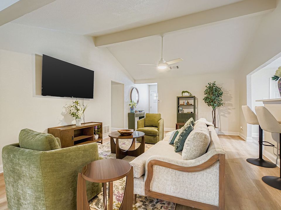 Relax in the bright and open living room featuring a smart TV, comfortable seating, and fast Wi-Fi throughout the home. The home also includes a dedicated workspace for remote work or virtual meetings, along with a washer and dryer for added convenience during your stays.