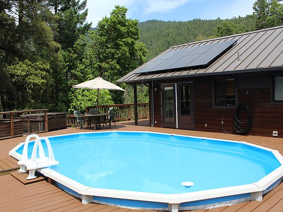 Custom Summer getaway with river view in Trinity Village! This 2 bedroom, 1 bath home features soaring pine cathedral ceilings, view windows, a wood stove and is adjacent to the National Forest with views of the Trinity River. Over 1800 Sq. Ft. of decking wrap around this home with newer above ground pool, newer Trex decking around pool area, newer metal roof, newer solar panels and a hot tub. Fully fenced yard for privacy, and a separate fenced garden area with fruit trees and raspberry bushes. Deeded river access and is easy to show.