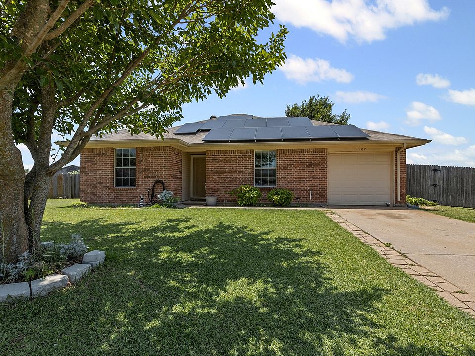 Don’t miss this opportunity to own a charming home situated on a spacious corner lot with a long driveway in a cul-de-sac, mature shade tree, and a welcoming covered entrance. Energy efficiency is a standout feature with paid-off solar panels at closing, helping reduce utility costs from day one. This 3-bedroom, 2-bath home features wood-look tile flooring throughout, both stylish and low-maintenance. The comfortable living room flows easily into the dining area, creating a perfect space for daily living and entertaining. The kitchen offers ample upper and lower cabinetry, built-in microwave, oven, dishwasher, and optional bar seating. The spacious primary suite includes a private en suite bath with a shower-tub combo and great storage, ideal for a relaxing retreat. Secondary bedrooms are well-sized with generous closets and share a full hall bath. All rooms are equipped with ceiling fans for added airflow and comfort. Step outside to a huge backyard with a covered patio, perfect for BBQs, outdoor dining, or creating your dream garden space. Come see this move-in-ready home that blends comfort, affordability, and energy efficiency!