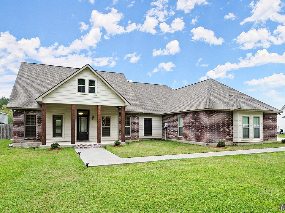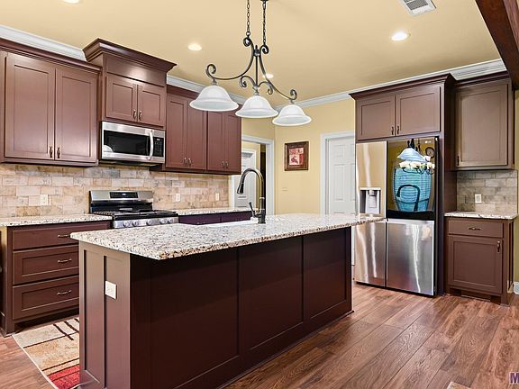 Welcome home to this custom-built 4-bedroom, 2.5-bathroom home on a generous 0.68-acre lot. The open floor plan showcases wood-look ceramic tile floors, crown molding, and custom window trim throughout. The kitchen features granite counters, a large island, farmhouse sink, 6-burner gas stove, stylish tile backsplash, stainless appliances, and a large walk-in pantry. Beautiful wood beam separates the kitchen and living room where you can enjoy a brick ventless gas fireplace with a solid wood mantle serving as a focal point, exuding warmth and character. Natural light streams in through the windows, offering fantastic views of the back patio and yard. The oversized laundry room is equipped with built-in cabinets, providing convenient storage solutions, along with space for an additional refrigerator or freezer. Step outside to the impressive covered back patio, featuring a beautiful stained wood ceiling, ideal for outdoor entertaining or simply unwinding amidst the serene surroundings. Backyard is fully fenced with a privacy wood fence on each side and metal fence across the back allowing you to enjoy the wildlife. Call to schedule your showing today!