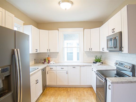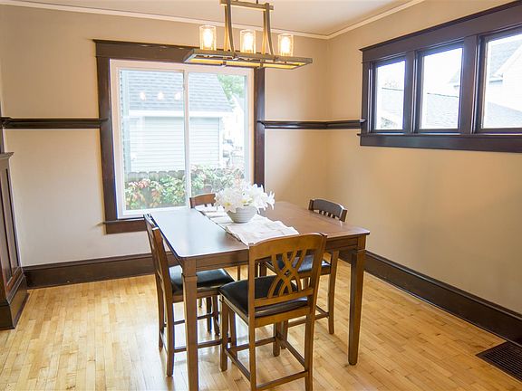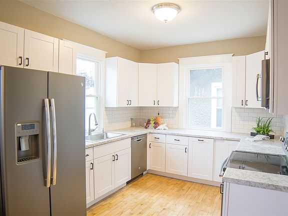 A great front porch welcomes you into this charming home that has been completely updated. The refinished hardwood floors run throughout this character filled home with all the original woodwork. Updated windows, front door and a brand new kitchen with stainless steel appliances included. French doors open into a home's office. Upstairs are the homes two bedrooms and an updated bathroom. Home features a newer roof & furnace and now a brand new water heater. A large 2.5 car garage round out all what this home has to offer.