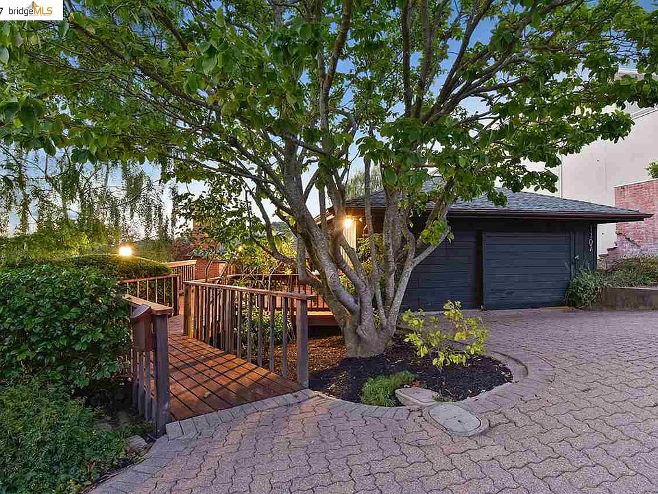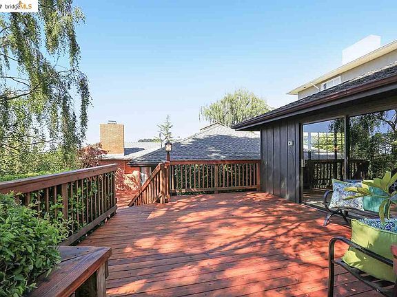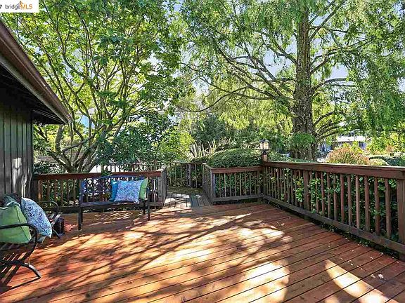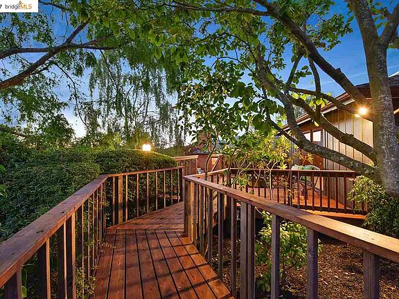 This mid-century modern home offers the best of both worlds: peace and tranquility on the edge of Tilden Park, while just minutes away from the urban riches of North Berkeley: world-famous restaurants, cafes, & shops of the Gourmet Ghetto and Solano Avenue, plus bus and BART commute options. Contemporary finishes in the eat-in kitchen include shaker style cabinet doors, subway tile backsplash, stainless appliances, and a butcher block island. The large living room and family room each feature a wall of gorgeous, custom built-in cabinetry, and the huge skylight at the end of the hall floods sunlight into the bedrooms throughout the day. Perhaps the best secret is the newly added (c. 2012, w/ permits) private master suite, on its own level. Enormous, walk-in closet, angled corner built-in cabinetry, walls of glass doors leading outdoors, a bonus space for a home office, and a luxurious bathroom complete the ideal escape. The flexible floor plan offers versatile uses, since use of the the family room and master bedroom could be reversed, or the lower level suite could potentially serve as an au-pair with separate entrance. In addition to the four bedrooms and three bathrooms (2,525 square feet), there are extras, including the sewing room off the laundry room, and large detached two-car garage which serves a great bonus space or studio, for games, recreation, or hobbies. If you aren't familiar with the Park Hills Homeowners Association, it's a warm and welcoming community with shared open park spaces. The grassy meadow behind 1107 Park Hills, "Muir Green", is one of a handful of shared spaces - just seven neighbors have direct access through gates in their backyards. The neighborhood offers pedestrian paths and hiking trails to Tilden's Lake Anza, Botanical Gardens, Golf Course (with a bar and grill), the Tilden carousel and Wildcat Canyon.