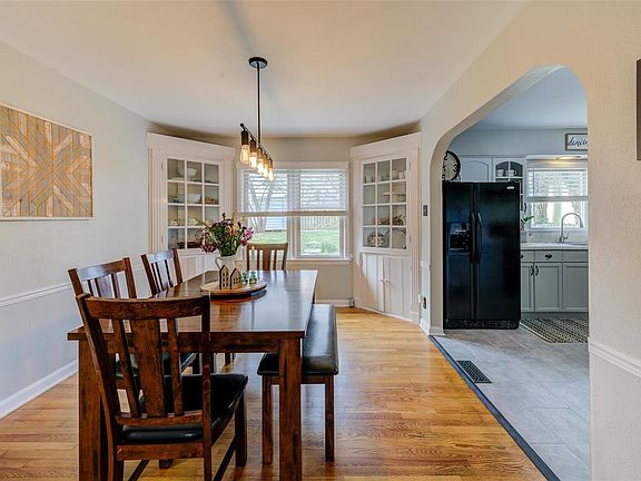 Fall in love the moment you arrive at this charming home featuring a covered front porch. The main level boasts wood floors, with luxury laminate in the kitchen. Enjoy a spacious living room and updated light fixtures. The dining room, with its built-in corner cabinets, adds character, while arch doorways and a beautifully restored front door with side lights bring in natural light. The kitchen includes glass-front cabinets perfect for displaying your favorite items. The breezeway features fun tile flooring and connects to the garage, both providing access to the backyard. The lower level offers a dry bar, a rec area, a potential home office, and a full bath—perfect for keeping the upstairs pristine for guests. An attached one-car garage completes the package. Ideally located within walking distance to Pine Room, ice cream shops, a grocery store, and Main Street, you can leave parking worries behind and enjoy the convenience of walking everywhere!