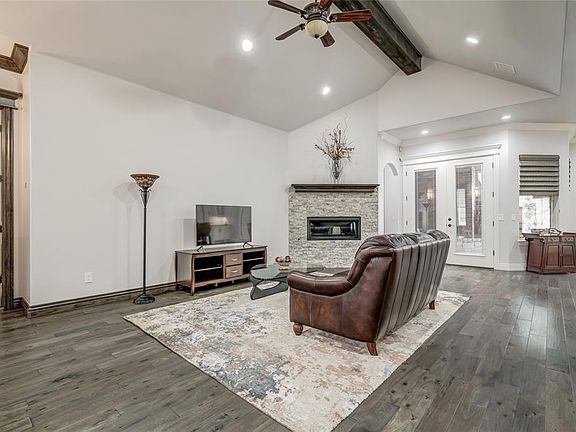 This home boasts so many things as you enter the open living and kitchen areas, you are drawn to the linear fireplace. The chef's kitchen has plenty of counter space and gas stovetop. The beautiful cabinetry and fixtures are very detailed. You'll love the split floor plan. This home is complete with 2 en suite bedrooms. The primary bedroom has 2 separate vanities, walk in shower, tub and large walk in closet with built ins. Enjoy your morning coffee on the peaceful covered back patio with fireplace. See all the extra touches including a huge laundry room, plenty of storage and above ground metal tornado shelter in garage.