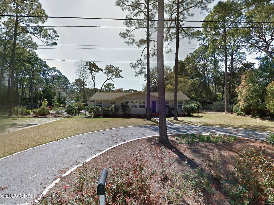 A charming retreat nestled on a beautifully landscaped half acre in Panama City. Surrounded by mature trees and vibrant flowering plants, this 3-bedroom, 2-bathroom home exudes charm and modern comfort. Step inside to discover a bright and open floor plan designed for easy living. Remodeled with an effective age of 2002 boasts nice countertops, stainless steel appliances, and a stylish tile backsplash, perfect for culinary enthusiasts. The home offers serene views of the lush backyard, creating the ideal space for relaxation or entertaining. The property is thoughtfully equipped with ample an extraordinary irrigation system, circular driveway and additional driveway for access to back yard and parking options for RV or boat parking area. For hobbyists and DIYers, there's a spacious detached workshop that provides even more space for your outdoor gear and tools. Water enthusiasts will appreciate the fact it is located a few blocks to the Bay making it easy to launch your kayak, paddleboard, or wave runner for water adventures. The home is centrally located with easy access to shopping, military bases, hospital and the world's most beautiful beaches This meticulously maintained property offers a perfect blend of charm, functionality, and seclusion.