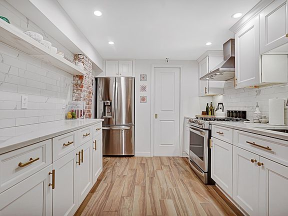 One-family style living, with condo ease! This beautiful, quiet 2br, 2.5 bath duplex home is a showstopper. Incredibly designed interior and an equally exceptional huge private yard. The spacious first level has a gorgeous kitchen with quartz counters, brass hardware/accents, SS appliances, custom cabinets & classic exposed brick. Bright large family room boasts fireplace with custom shiplap wall and slider that leads to the private wonderfully designed entertainer's garden that features a modern tiled accent wall, elevated deck and pavers. The dining room is stunning and large enough for serious entertaining, also features beautiful exposed brick and custom lighting, and a pretty half bath with Serena and Lily wallpaper rounds out this level. Second floor boasts master bedroom with high tray ceiling, his/hers closets and exposed brick. Modern slatted barn door opens to a spacious modern bathroom with gorgeous designer tiles throughout, large bathtub and brizo sink. 2nd bedroom is exquisitely designed with excellent storage, custom shelving and a large modern bath with spacious closet & new W/D. Other highlights include new Andersen windows throughout, 4 zone mini split HVAC system (as well as baseboard heat), tankless hot water heater, exposed brick details throughout, custom lighting & modern barn doors, excellent closet space including masterfully designed under staircase drawers and an incredibly low mthly maintenance! Bldg has storage room with designated area for the unit, conveniently located across hall, building common areas/vestibule are newly renovated. Parking garage 2 blocks away, NYC bus 15 steps away on corner, NYC ferry 3 blocks away, steps to all that Hoboken has to offer. This is a must see in an incredible location. No Hurricane Sandy damage.