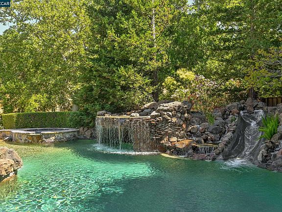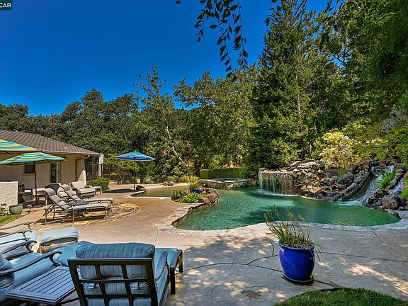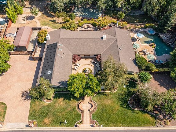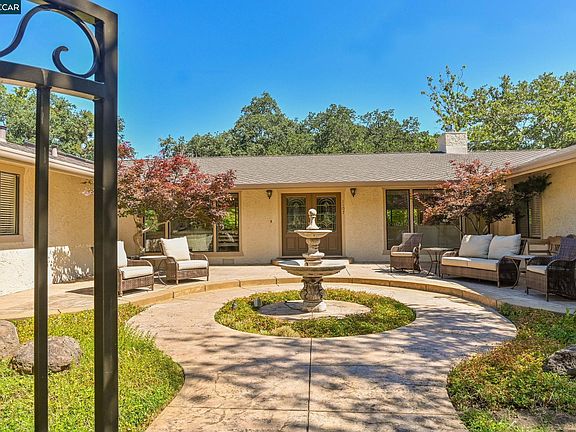 Sensational Single Story Ranchette on approx. .99 acres nestled on a court surrounded by a wooded & natural setting w/ stunning Mt. Diablo views offering country living at it's finest yet a short drive to downtown! Pristine manicured front grounds boasts sprawling lawns & gated courtyard. Entry leads to separate formal dining room designed for large gatherings with a half wall to adjacent formal living room w/ wood floors, vaulted plank & beam ceiling & cozy fireplace! Gourmet kitchen features 2 islands with slab counters, built-in appliances including Fridge, sunny windows & multiple skylights. Adjoining family room offers a gorgeous stacked stone fireplace w/ raised hearth, wood floors & wall of windows! Enormous primary suite includes walk-in closet & retreat area. Luxurious bath boasts a separate oversized tub, spacious stall shower, makeup vanity & dual sinks. Step outside & enjoy your own 5-Star oasis w/ beach entry freeform pool w/ waterfall grotto & additional waterfall features, slide & separate spa, spacious patio, lush lawn areas, basketball court & outdoor fireplace. Additional property features: built-in BBQ island with bar seating, 3 car garage + ample parking areas including covered RV storage, multiple sitting areas, & nature fencing. City water! Must see!