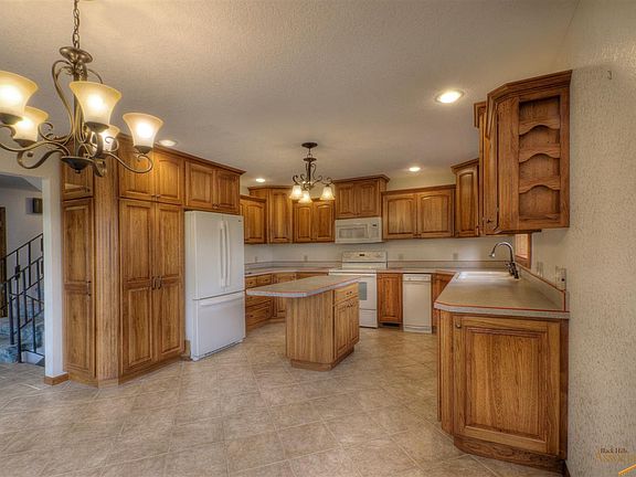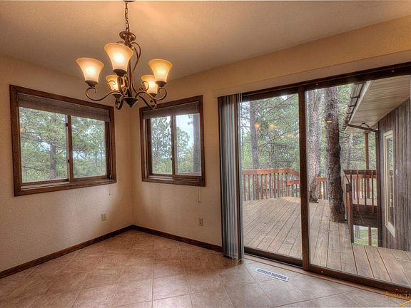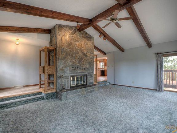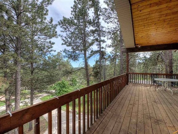The definition of a Black Hills Home! Placed on 1.84 wooded acres, this 5 bedroom and 3 bathroom home has been built and cared for by the same owner. 3 large slate fireplaces adorn each level of this home. At the top is the master suite, study and enormous bonus room addition. The main level holds a large family room with updated kitchen just off to the side and expansive deck just outside the sliding glass doors. 3 bedrooms are on the main level as well. The lower level has a family room, work room, storage, laundry and another bedroom. Put the rocking chairs out on the massive front porch and watch the kids play hoops or handball on the fenced recreation court.