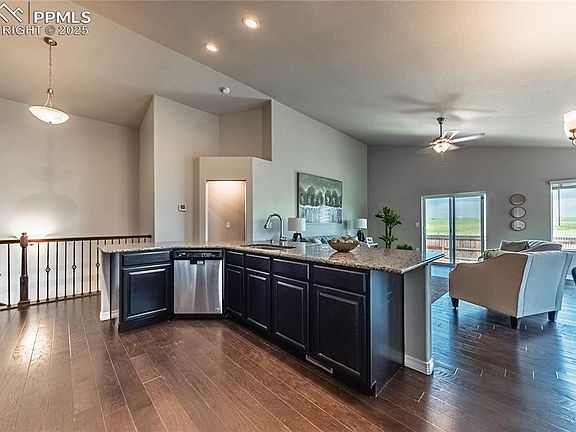 Welcome home to this spacious and upgraded 5-bedroom, 3-bath ranch-style home with a 3-car garage, nestled in the fast-growing, military-friendly community of Lorson Ranch. From the moment you arrive, you’ll appreciate the curb appeal and quiet setting with no rear neighbors—this lot backs directly to open space, offering rare privacy and GORGEOUS panoramic views of Pikes Peak and the front range. Step inside to soaring vaulted ceilings and a bright, open layout that flows seamlessly through the main living space. The gourmet kitchen features granite countertops, stainless steel appliances, a large center island with bar seating, and rich cabinetry. The kitchen overlooks a massive living and dining area—ideal for entertaining or family gatherings. The home is equipped with air conditioning to help cool you off during the hot Colorado summers, and a BRAND NEW ROOF in 2024! The main-level master retreat includes its own vaulted ceiling, large window with open views, and a stylish barn door leading to a luxurious 5-piece en-suite bathroom with a spa-style shower, oversized soaking tub, dual vanities, and a walk-in closet. Two more main-floor bedrooms and a full bath offer plenty of space for guests or home offices. Downstairs, the fully finished basement expands the living space with two additional bedrooms, a large full bathroom, a generous secondary living area, and a hardwood-floored flex space—perfect for a gym, playroom, or creative studio. Additional highlights include a main-level laundry room, abundant storage, and a location just minutes from Grand Mountain School (K–8) and multiple military bases including Fort Carson and Peterson SFB. Whether you're looking for space to grow or a turn-key family home, this one checks all the boxes!