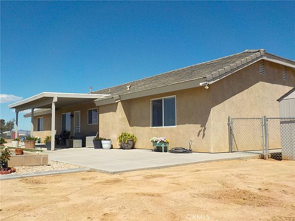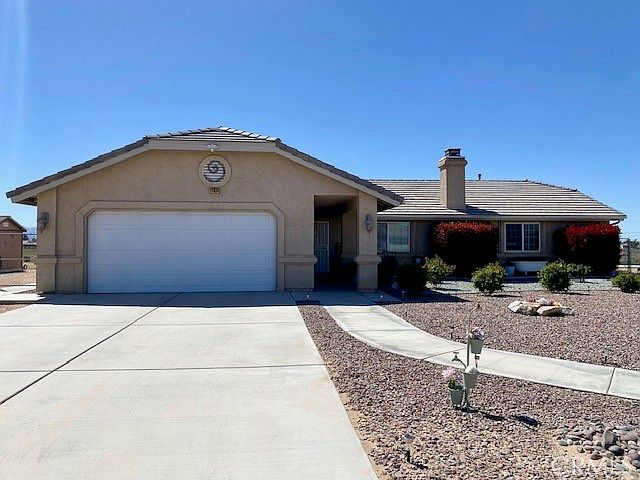LOOK LOOK LOOK at this Lovely Apple Valley Tile Roof HOME on Almost an Acre!!! This property is fenced and cross fenced!! Enter into this HOME SWEEEEEET HOME and you will find an open living/dining area with Cathedral Ceilings and a Beautiful pellet stove fireplace feature wall. This 3 Bedroom 2 bath split floor plan has a large owner's suite with a high ceiling and a closet room. The on suite bath has double sinks and a full shower. Two Bedrooms with oversized closets and a full bath are off the Great Room. Oversized garage and Indoor Laundry Room with cabinets. Refrigerator, Washer and Dryer are included. Landscaping in front and back yards. The side yard is fenced. The kitchen views the outdoor entertaining space that is perfect for enjoying the desert views. Large Pantry. Bring your favorite patio chairs to lounge under the back covered Patio and to relax on the front porch. The Two Sheds are included. This is a Charming MOVE IN ready home!!