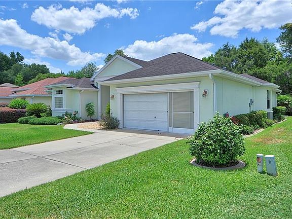 Lots of Curb Appeal, Mature Landscaping with cement curbing and Privacy in the Rear. From the moment you walk up to large covered entry with columns (with plenty of room for a few rocking chairs) to this is a custom 3/2/2 CBS Monaco Model, you will enter the double doors to an open concept living area with 12 foot Volume Ceilings. The original owner has meticulously maintained this beauty with lots of details, from the decorative tile to all the special touches you will find throughout including a stained- glass window above the master bedroom doors. Double Doors lead to the Master Suite with Real Hardwood Floors, Tray Ceiling, Double Walk in Closets, Comfort Height Vanity, and Walk-in Shower. Tile, Laminate and Hardwood throughout, except very nice, clean carpet in the formal dining room. The kitchen boasts Solid Oak Cabinets with pull-outs and soft-closed doors, Island, lots of cabinet and counter space PLUS an eat-in breakfast nook with bay style window, and a large breakfast bar. Home is very clean and has abundant natural lighting. There is a French Door off the Breakfast nook area that leads to a very large, 402 sq ft screened in lanai with decorative tile flooring. So many extras Screened Garage Door, Gutters and Downspouts, Inside Laundry with Utility Sink, Security System, Medical Alert System, Pull Down Attic Stairs in Garage, Extra Insulation in the Rafters throughout the home and more. Oak Run boasts tons of amenities, including several pools, 18 hole championship golf course, fitness center, several clubhouses and more.