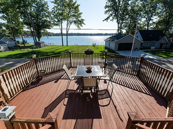First time offered for sale. Don’t miss this opportunity to own a one-of-a-kind 4+ bedroom, 3-bath home with over 3,000 square feet of living space on beautiful Eight Point Lake. Includes 25x111 of private lake access to design your dream gazebo, outdoor kitchen, or entertaining space. Enjoy off-water taxes while still capturing spectacular lake views! This unique build includes a ground-level, 31x42 two car garage with room for vehicles, storage, and toys, plus mechanical room. A recently installed Generac 24k whole-house generator ensures peace of mind. From the garage, access the home by elevator or take the stairs up freshly stained multi-level decks to the main entry. The main level features a nearly 400 sq ft primary suite, complete with French doors leading into a 300 sq. ft. polygonal bay room where you’ll enjoy breathtaking sunrises and water views. The kitchen and dining areas feature cathedral ceilings, a large island with additional seating for five, and access to the large lake facing deck. The living room includes a natural gas fireplace for winter evenings, and french door access to the bay room. Two additional bedrooms, one with direct access to the back deck, along with a second full bath and large laundry room complete this level. Upstairs offers more cathedral ceilings with space to relax and entertain: an additional bedroom, full bath, wet bar, game room, family room, generous storage areas, and more breathtaking water views. The large lot provides expansive green space along with a 42x32 pole barn featuring 13 ft sidewalls, concrete approach and floors, 8x8 and 10x10 overhead doors, two service doors, and 100-amp panel. Eight Point Lake is known for excellent fishing, water recreation, sandbar gatherings, golf cart rides, summer concerts, and holiday events, including the July 4th 5k and Labor Day fireworks. Whether for seasonal use or year-round living, this home offers a great opportunity to enjoy all that lake living has to offer.