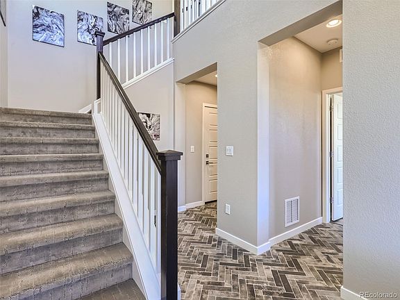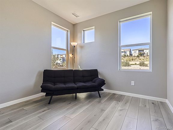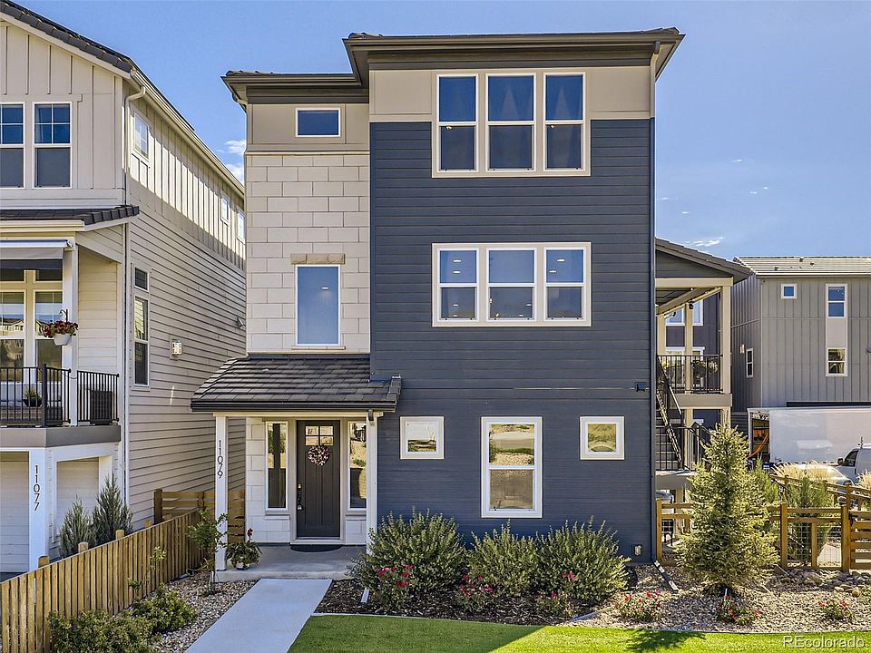 Why wait for new when this gorgeous home is ready now?! Great location on a corner with no home beside it. This beautiful three story smart house with built in wifi in Stepping Stone built by Shea features 4 bedrooms (1 main, 3 third floor), 3.5 baths (1 full main, 1/2 second floor, 1 full & 1 3/4 third floor), 2nd floor kitchen, dining, great room, laundry and main level 2-car garage (rear entry). Meticulously maintained - Pride of ownership shines throughout. Over $100,000 in upgrades make this home stand out. Beautiful upgrades and finishes including slab marble counters, stainless steel appliances, hardwood floors, the gorgeous & efficient gas fireplace and more. Low maintenance living (flower beds & synthetic turf lawn - front and side yard) - lower water bills because of the very efficient drip lines. Just lock up and go. The many windows allow the natural light to cascade in - bright and cheerful. The energy efficient air conditioner & furnace (dual thermostats for both up & down stairs) keep this home comfortable all year long keeping energy bills low. Fronts to walking path. Relax on the covered balcony deck & covered patio or people watch from the covered front porch. This home is in the Meridian Village Metro District #2. Fabulous community with great amenities including the clubhouse and community pool. Close to dining, shopping, entertainment and other amenities.