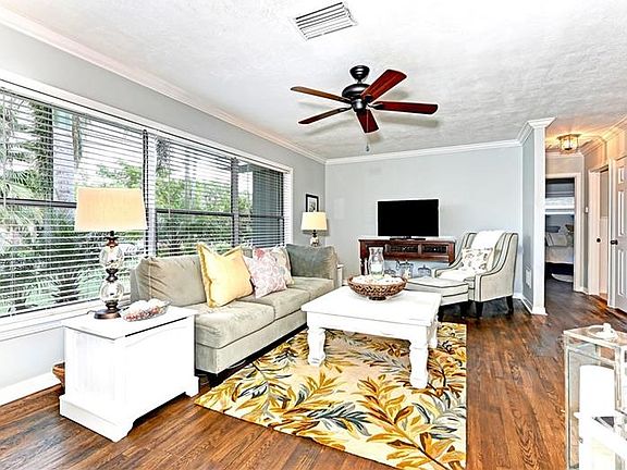 Classic Florida 3 bedroom + den / 3 bath ranch in this central Bradenton location with easy access to Sarasota International Airport, world class shopping & dining at UTC Mall and I-75 to Tampa/St Pete and Sarasota. Award winning Gulf beaches are a short drive away. Inviting slated patio entry with complimentary hand crafted shutters and framing columns. Professionally painted interior and exterior. Designer details include 4" baseboards, crown molding, raised panel doors throughout as well as bright bead board in both baths and board and batten in living room and foyer adding character and style. Meticulously refinished original hardwood oak floors throughout the living room, dining room, hallways and 2 guest bedrooms. Oversized master bedroom en suite with brand new hardwood flooring and travertine bathroom floor and vanity. Kitchen features 42' cabinets, tumbled marble backsplash, granite countertops and tile flooring. Structural upgrades include: Newer windows in bedrooms, baths and kitchen, roof with architectural shingles, A/C and electric panel box in the past few years. Den could be fourth bedroom en-suite with kitchenette and separate entrance/driveway is ideal for extended family as an in-law apartment, nanny's quarters or home office. French doors lead from dining room to private courtyard patio with hot tub hook-up. Home is situated on tropically landscaped and fenced 1/3 acre corner lot. Ample room for oasis style pool and spa. RV/Boat parking too