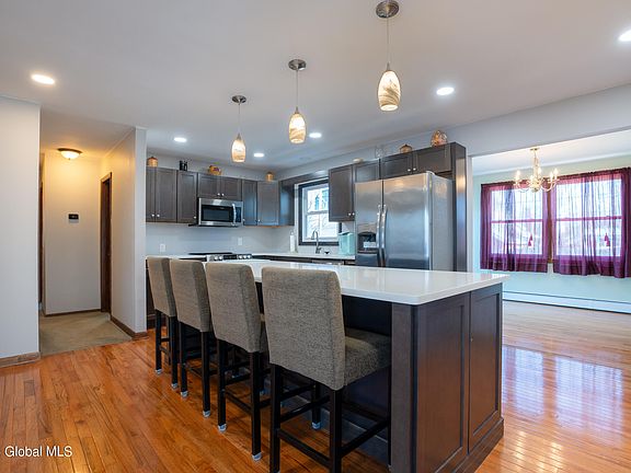 Welcome to this meticulously maintained ranch home with a stunning open floor plan. The expertly renovated kitchen includes an 8 foot island with quartz countertop! Convenient soft close drawers as well as a walk-in pantry & built in lit hutch! The gourmet kitchen opens to the living room, family room as well as the dining room which has 8 ft sliding doors to the deck overlooking the well sized backyard. One floor living with first floor laundry. Newer oak hardwood flooring throughout the living space while the carpet protects maple hardwood flooring. The 20x16 shed which is being sold 'as is' is in need of new roof. Vinyl siding covers the original cedar siding. Full basement with additional storage and large rec space/ work space. Roof new 2022!