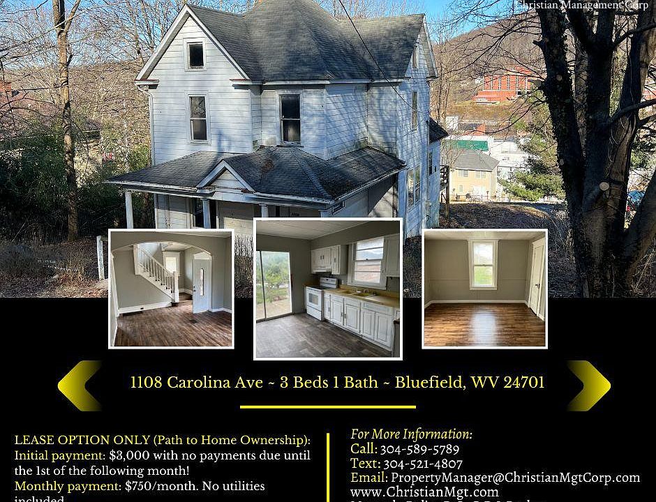1108 Carolina Ave ~ 3 Beds 1 Bath ~ Bluefield, WV 24701 LEASE OPTION ONLY (Path to Home Ownership): Initial payment: $3,000 with no payments due until the 1st of the following month! Monthly payment: $750/month. No utilities included. Sorry, this home is not HUD approved. This three bedroom, one bath, two-story approximately 1,500 sq. foot home has large bedrooms, a full-size basement, and a large backyard located at 1108 Carolina Avenue, near Bluefield Ave, within walking distance to shopping and restaurants. The home was just remodeled consisting of newly painted walls and ceilings, new flooring in most of the rooms, new decking, new electrical upgrade, etc. and features a large covered front porch that is wrapped halfway around the home. The home features electric baseboards and gas heat the home. Start building memories that last forever by making this your home today! Christian Management Corporation Office Hours: M-F 9am-5pm & 10am-2pm the 1st Saturday of every month You can view THIS property 7 days a week! Most pets welcome with a $200 pet fee and signed pet agreement. Maximum 2 pets. No aggressive breeds or outside only animals due to insurance restrictions. Clean, safe, quiet, crime & drug free is our goal. We Support Equal Housing Opportunities! Good people with good, bad, low, or no credit but stable employment or Social Security are welcome. Criminal Checks: -NO recent felonies in the last 7 years -NO evictions in the last 7 years -NO sex offenders Is this property not what you are looking for? View our other available #homes, #mobilehomes, #apartments, and more on our Facebook or our Website.
