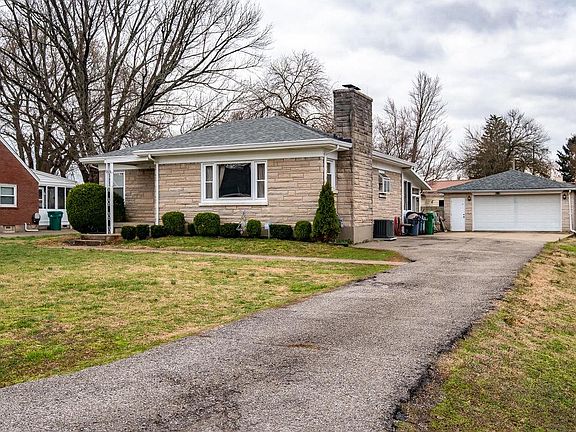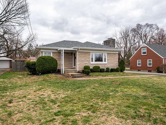 This 2 BR, 1 BA Bedford Stone home has plenty of great features. Large Picture Window, Hardwood floors throughout much of main level, Stone Fireplace, Open Eat-in Kitchen, Updated Bath, and a Sunroom w/brick flooring. The basement is partially finished and ready to become a great recreation area. AC and Roof are approx 3 yrs old and Hot Water Heater is under 4 yrs old. Replacement Windows except main picture window approx 8-9 yrs old. The large 2.5 car Garage has a workshop area added to the back and has a furnace & the possibility for a half bath. The back yard is perfect for play and fire pit evenings. Close to the Gene Snyder, shopping and schools.