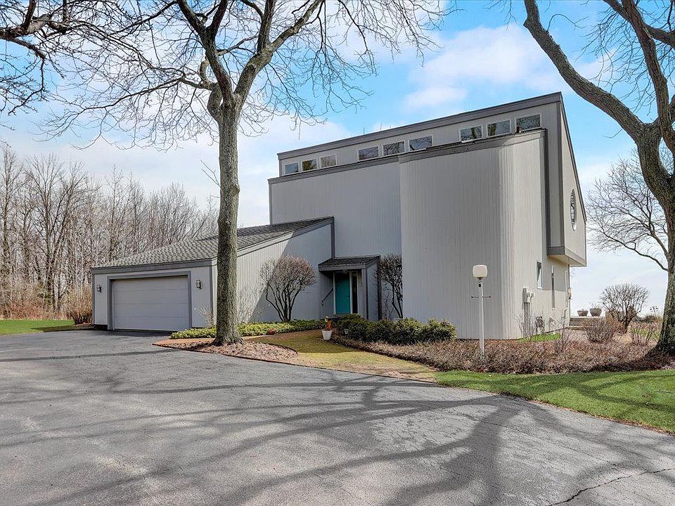 Welcome to this custom-built contemporary home on the shores of Lake Michigan! This unique property was lovingly maintained & has special features around every corner - circular windows, 2-sided FPs, private rooms, walls of windows & AMAZING views from almost every room. Get ready to watch the sunrise from your bed, the change of seasons & daily visits from wildlife! Entertain in LR w/ vaulted ceilings & gorgeous lake views or relax in the owner's suite w/ a private balcony, FP, WIC, oversized jaccuzi tub, walk-in shower & private workout room w/ access only thru owner's BA via a spiral staircase. The guest BR incl. a balcony, access to hall BA & a ladder to a loft. Room in LL could be converted to BR space by installing egress window. Water views from beautiful landscaped private lot.