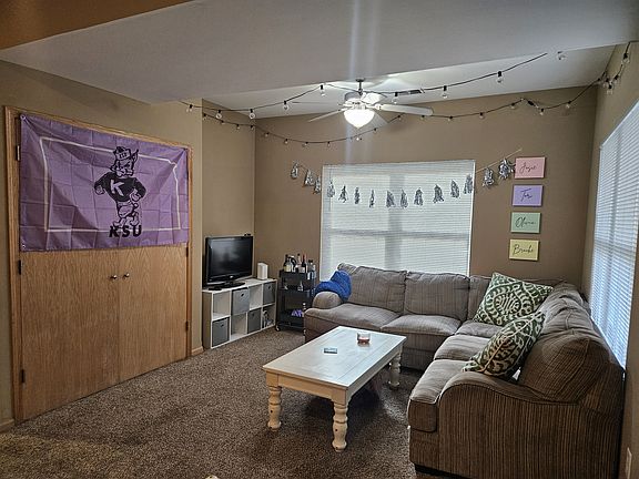 Very nice, 4 bedroom, 2 bathroom half duplex located one block from K-State campus. The main floor is open with a spacious living room, dining area, and large kitchen with an eating bar. There is one bedroom on the main floor and a full bathroom that doubles as a safe room for storms. Each bedroom has its own sink and vanity. Upstairs are three more good sized bedrooms and a second full bathroom. There is a parking lot with designated spots. Owner pays for trash. Tenant pays for remaining utilities.