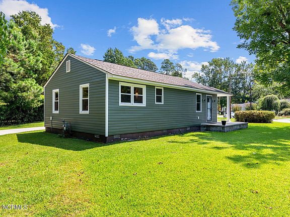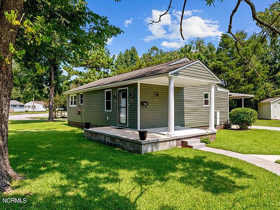 PRICED BELOW CURRENT APPRAISED VALUE! This immaculate, move-in-ready home boasts stunning sand-finished hardwood floors throughout and an open floor plan perfect for entertaining. Enjoy seamless indoor-outdoor living with access to a covered porch and a covered patio area in the back. The living room features custom built-ins with recessed lighting in each nook, a designated spot for your flat-screen TV, and an updated ceiling fan with remote control. The kitchen is equipped with modern cabinets, granite countertops, a built-in faucet glass cleaner, a natural gas stove, a French door refrigerator, a built-in microwave, and a dishwasher—all of which are included in the sale. The master suite offers a remote-controlled fan, an oversized step-in tile shower with dual shower heads, double vanities (mirror on order and to be installed), a private water closet, and great closet space. The guest bedroom also includes a remote-controlled fan and convenient access to the hall full bathroom. The home has been thoughtfully updated with two closets removed to accommodate the included washer and dryer. Recent upgrades include insulation added in 2019, new shingles in 2014, vinyl tilt windows, updated outdoor light fixtures, newer electrical and plumbing systems, new interior and exterior doors with hardware, and a tankless natural gas water heater. Located centrally, this property offers easy access to shopping, the hospital, and highways 17 and 70.