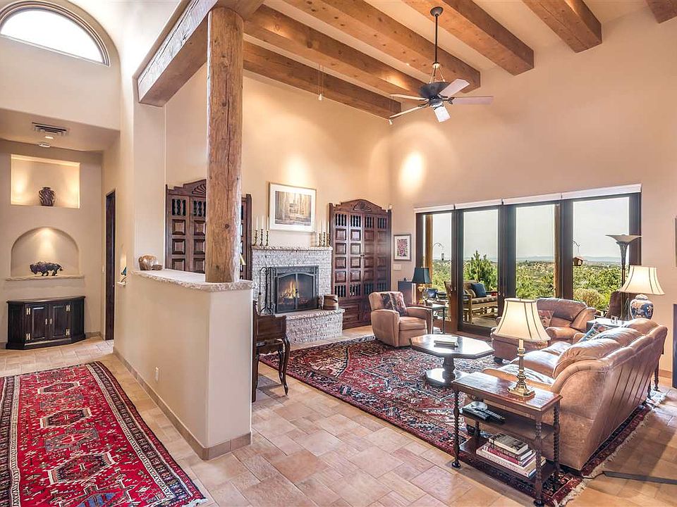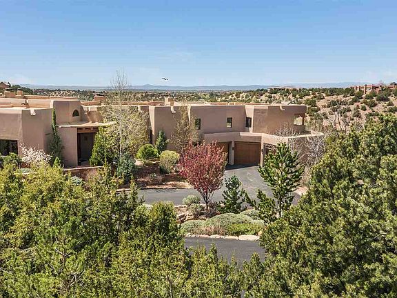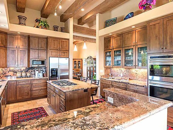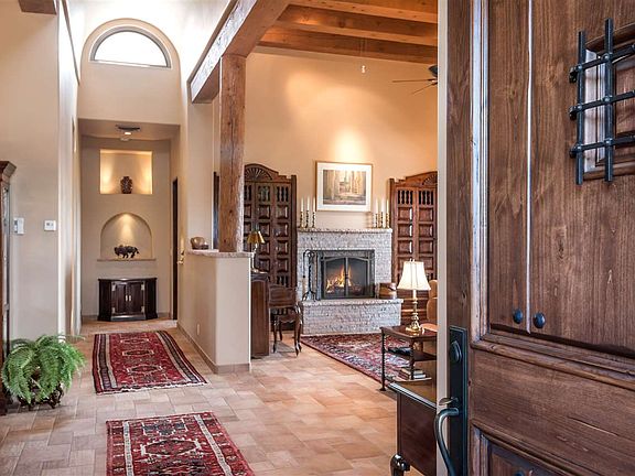 Ravishing sunsets and sweeping mountain views. Outstanding Sierra del Norte contemporary pueblo home designed by Larry Andren, custom built in 2008. Private drive to the motor court and 3-car garage. The main level has elegant Italian textured tile floors throughout, and ZERO steps. The 15' high entry and galleria barrel vault ceiling is a stunning focal point. The handsome living room has a soaring beamed ceiling, fireplace flanked by gorgeous custom cabinets, and French doors to the Grand Portal. The superb kitchen with fine crafted cabinetry and luscious granite counters makes cooking a joy, with Wolf cook top and double ovens, Sharp microwave, 2 Asko dishwashers, and big pantry. An adjacent 13' high family room/office with fireplace accesses the Grand Portal. Entertain beautifully in the open dining room, or on the flagstone portal with gas grill outlets and kiva fireplace. An excellent master features a 13' beamed ceiling, kiva fireplace, French doors to the portal, a 12'+ x 12+' fitted closet, and spacious bath with jetted tub, walk-in shower and flagstone terrace with pond and waterfall. Take a half-flight of stairs or elevator to a separate two guestroom wing with en suite baths and big views. An art studio can also be a hobby/sewing room or office. Fabulous established gardens, including evergreens, fruit trees and flowering shrubs, on drip irrigation. Impeccable!