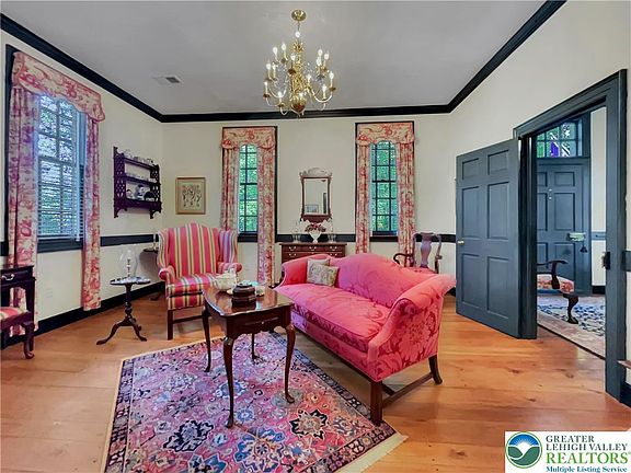 Gorgeous 3BR, 2.5BA 18th-Century Reproduction on 3.75 peaceful, private acres in Alburtis. Lovingly built by the Sellers using blueprints of the Orrell House at Colonial Williamsburg, this home blends reclaimed materials, reproductions, and fine craftsmanship to create an authentic Colonial reproduction. The charm begins as you pull down the drive & continues through the front door into the formal Entry Hall, featuring Southern Yellow Pine floors w/ radiant heat, antique banister, & period molding. The LR showcases a Rumford fireplace w/ custom mantle. The Chef’s Kitchen includes soapstone counters & sink, Bird’s Eye Maple island, GE appliances, & raised-panel cabinetry. The DR features another Rumford fireplace, built-in cabinetry, & rich wood floors. A brick-floored Mud Room offers access to the back porch & a full Bath with walk-in shower, Tiger Maple vanity, & radiant heat. Upstairs, the BR includes a Rumford fireplace, walk-in closet, & radiant-heated floors. Two additional BR offer custom details, one with faux fireplace & the other with upper-level privacy. The full Bath features a jetted soaking tub & hand-painted porcelain sink. The LL boasts a Rumford fireplace, a unique “Caged Bar,” & a brick-floored Laundry Room w/ soapstone sink. Outside: a 3-car Garage w/ kennel, colonial gardens, period-style outbuildings, & outdoor fireplace. Property is being sold as-is. Schedule your private showing today & experience all this special property has to offer!