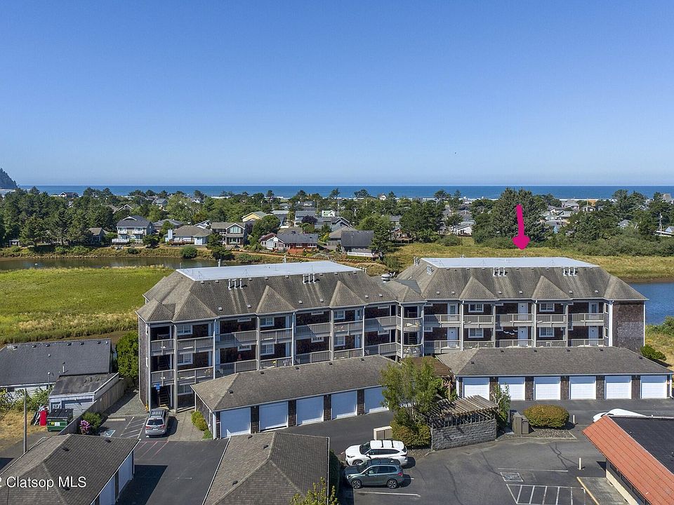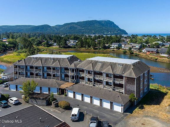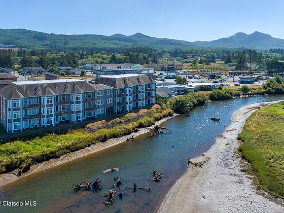 Enjoy fantastic views from this top floor riverfront unit on the quiet South end of downtown Seaside. Open floor plan and separation between bedrooms. Enjoy the views from your private riverfront balcony. Kitchen features an eating bar and a gas range. Washer/Dryer in spacious utility room just inside the entry. Detached Garage is right at the bottom of the stairs or Elevator. Downtown Seaside is close by but not too close! Great restaurants and services just a few minutes away!
