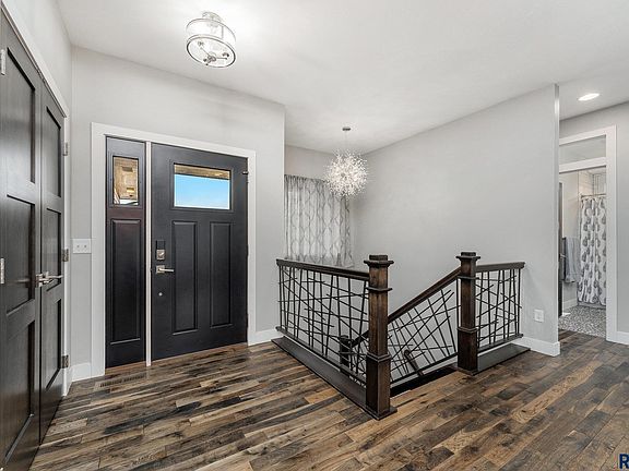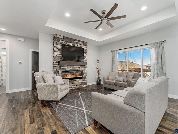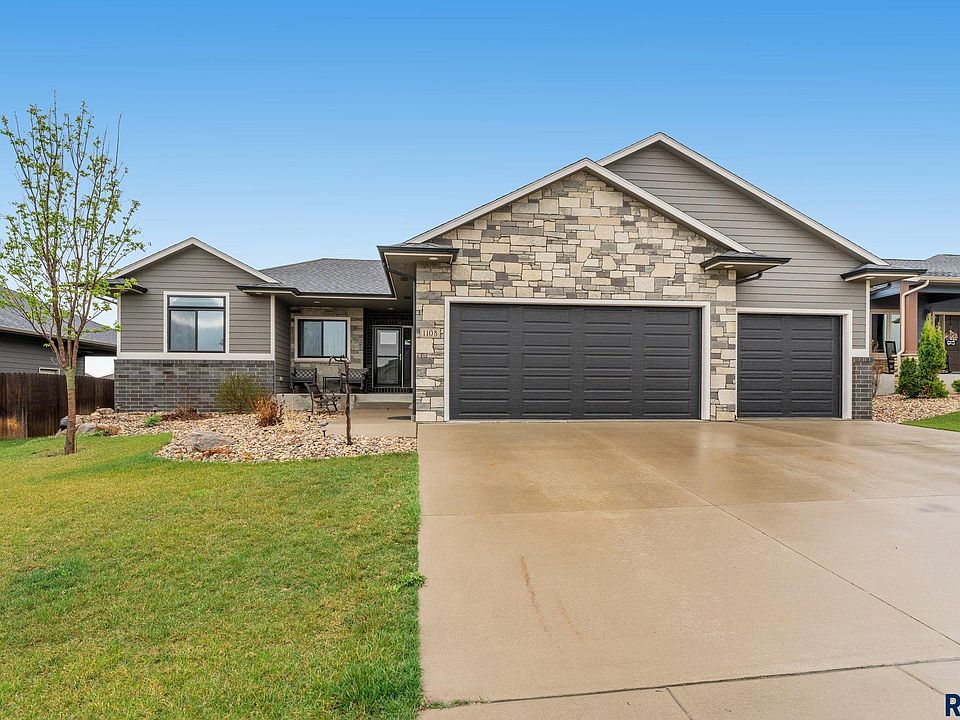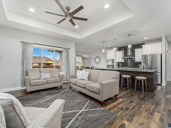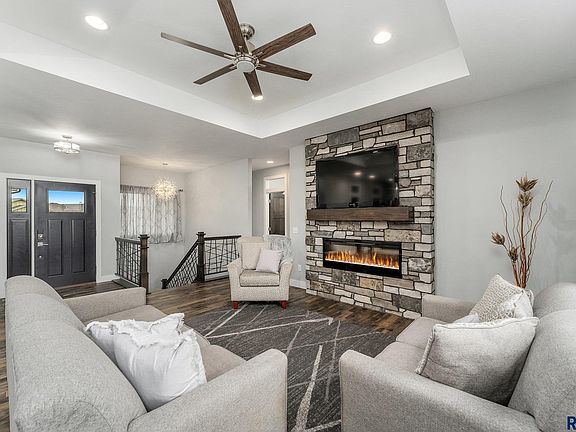Amazing finishes throughout this 5 bedroom, 3 bath ranch walkout on the west side of Sioux Falls. Dimension and curb appeal lead you into an open concept main living space including a living room with tray ceiling and electric fireplace amongst a stone accent wall, spacious dining space leading to one of the decks, and a stunning kitchen with granite counters, gas range and hood plus walk in pantry. Great drop zone with a bench, hooks and laundry space right off of the 3 stall garage featuring a heater, floor drain, H/C water with a utility sink. The primary bedroom offers a private deck, bathroom suite with soaker tub, tiled shower, double vanity and walk in closet. Two addition bedrooms and full bath finish off the main the level. The lower level is open and ready for entertaining. The wet bar is plumbed and ready for your finishes. Two more bedrooms, a full bath plus office space complete the lower level. Fenced yard plus patio space.