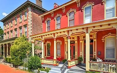 Classical 1870's brick Italianate style 3 bedroom home in historic Manchester. Loads of period detailing from tulip capital columns, original entry ceramic tile, etched glass entry doors, 5 marble/slate mantels, in-laid flooring and more! Spacious master bedroom with large closet. 3rd floor flex space can be 4th bedroom or sun filled family room. Open side porch off kitchen leads to private fenced in courtyard and 2 car detached garage. Conveniently located with easy access to light rail system, Casino, Science Center and stadiums.