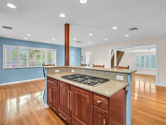 A truly remarkable residence in the heart of Hollywood Lakes. This two-story pool home, with 3 beds, 2 baths, and a 1-car garage, sits on a deep lot, extending to the prestigious north South Lake Drive. Has a unique open floor plan with red oak floors leading you to an open kitchen. Kitchen features are endless with an open island, granite countertops, a Subzero fridge, a Wolf stove top, a wall oven with a built-in microwave, and a warming door. This home offers flexible living space with 2 beds/1 bath downstairs and 1/1 upstairs. A gas fireplace with coral tile adds charm to the living room. The A/C was replaced in 2018 and the home has a connection for a portable generator that will be included.200 amp electrical with a surge protector, and shutter panels for all windows enhance comfort.