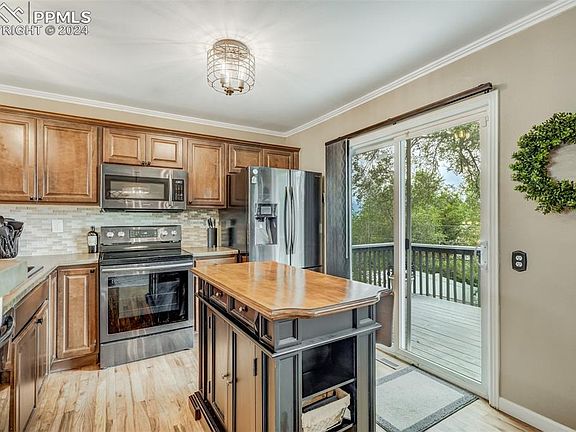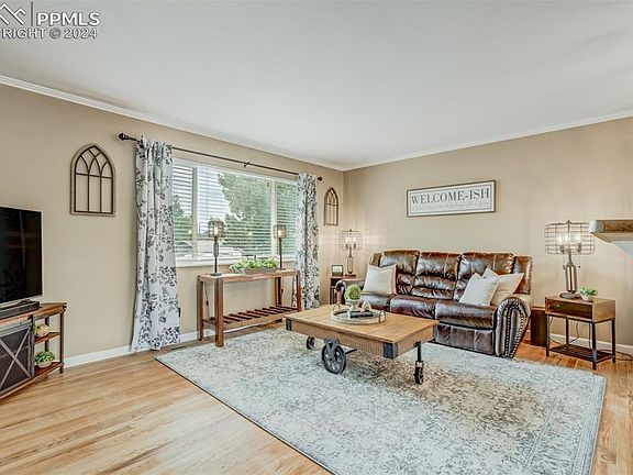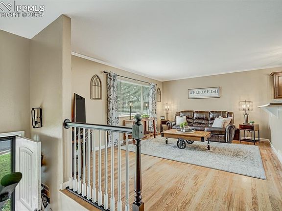 This charming 4-bedroom, 2-bathroom home sits on a spacious 1/2-acre lot with stunning views of Pikes Peak from the backyard. The upper level features wood floors throughout, with an open floor plan connecting the living room, kitchen, and dining area. Also on this level are the primary bedroom, a second bedroom, and a shared full bathroom. The lower level includes a generous family room, two additional bedrooms, a laundry area, and another bathroom.