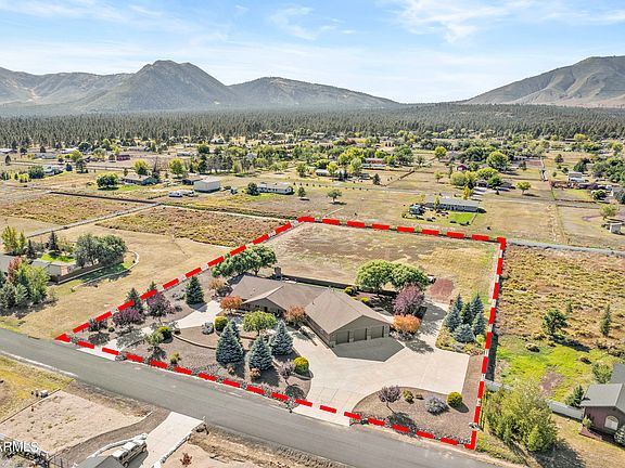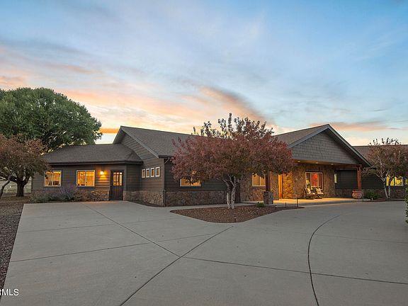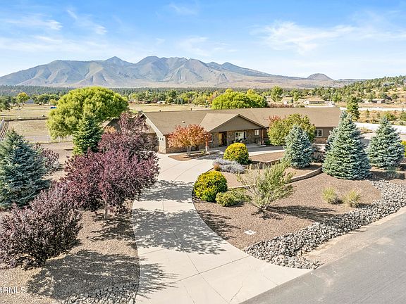 Treat yourself to the privacy of living on a large lot within Flagstaff's coveted Hutchison Acres community. Bring your horses to this meticulously maintained builder's home where you'll discover custom features throughout a sunlit split-plan layout crafted for entertaining. A circular driveway leads to the covered front porch where you'll enter an impeccable interior with 9-foot ceilings soaring above solid hickory doors, trim, and cabinets beautifully complemented by dramatic slate tile and river rock accents. In the spectacular family room set under a vaulted tongue-and-groove cathedral ceiling, your eyes are drawn to a stunning Malpais wall with its gas fireplace surrounded by display nooks and lighting. You'll have an acoustically insulated media room and a generously sized office with its own secluded entry, built-in work stations, and an oversized Champion Trophy safe. In the gourmet kitchen, dark green granite countertops and a Venetian glass backsplash perfectly accentuate the natural wood cabinets. A center island pairs with a pantry to provide plenty of prep and storage space. At 448sq/ft, the luxe primary retreat is substantial with two walk-in closets, a Jacuzzi tub, and a rainfall shower. There's an amazing backdrop of mountains behind your outdoor fireplace in the walled inner backyard.