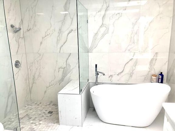 Renovated 2nd bath has White cabinet with marble counter, marble floors, curb less marble shower.