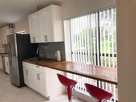 RE-PRICED for quick sale. Enjoy Country Club lifestyle in this Spacious, single-story home (2,793 sq ft under air) beautifully renovated 4 (could be 5) bedroom, 3 bath, 2 car and 1 golf cart garages, oversized driveway. SEPERATE WING (perfect for in-law or au pair suite) Vaulted LR/DR, Den, Playroom and vaulted Office, updated chef's kitchen with white solid wood shaker cabinets, butcher block countertops, stainless steel appliances. Located in sought after Boca Woods Country Club. Owner's suite includes a King-sized, vaulted sleeping area, spacious sitting room, 2 large walk-in closets, suit closet and a huge SHOE closet! Spa like, Master bath has a soaking tub, curb less rainfall shower, Skylights, solid wood Shaker cabinets with double sinks & quartz counter tops. 3-way split. Very spacious bedrooms with plenty of closet space, featuring a 3/way split. Second King-size bedroom is as large as most master bedrooms. Third queen-size bedroom has floor to ceiling window overlooking beautiful green space.
