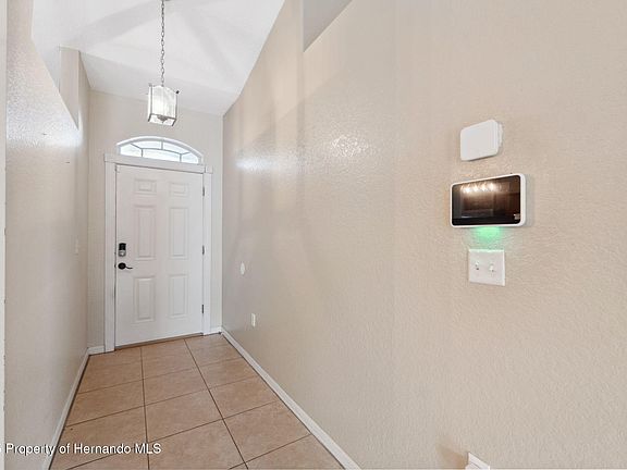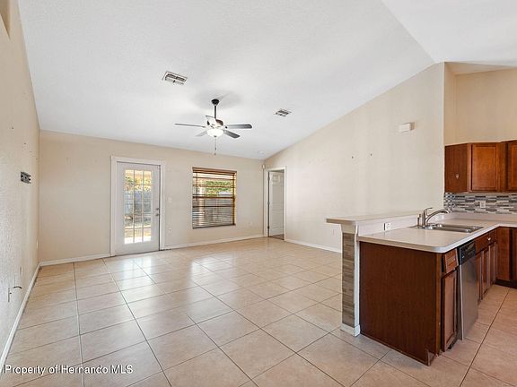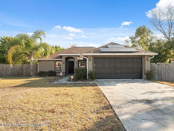 Welcome to your future home—a charming 3-bedroom, 2-bathroom residence in the heart of Spring Hill, Florida. This inviting abode features a new AC in 2020, new roof in 2021, and solar panels from 2022 which will be paid off at closing. It boasts a desirable split floor plan, ensuring privacy with the primary bedroom on one side and the additional bedrooms on the other, making it perfect for privacy. The open layout seamlessly connects the living area, kitchen, and dining space, creating an ideal environment for gatherings and entertaining guests. The living and wet areas feature durable tile flooring, offering both style and easy maintenance. The spacious primary bedroom includes an ensuite bathroom and an impressive walk-in closet measuring approximately 9'9'' x 9'2'', providing ample storage for your wardrobe and personal items. Part of the garage has been thoughtfully transformed into a versatile laundry and utility room, perfect for an office, exercise space, or playroom—the possibilities are endless. The remaining garage space, approximately 18'4'' x 11', offers plenty of room for storage or parking. The kitchen is designed with togetherness in mind, featuring a cozy breakfast nook and a convenient breakfast bar that encourage connecting during meal preparations. Step outside to the backyard, enclosed by a wooden fence for privacy, where you'll find a large patio with an awning cover, allowing you to enjoy the outdoors in any weather. Location is key, and this home delivers. A short 10-minute drive brings you to the Suncoast Parkway, providing quick access to Tampa for work or leisure. Additionally, the renowned Weeki Wachee Springs is approximately 12 miles away, offering enchanting mermaid shows, kayaking adventures, and a water park for all day fun.