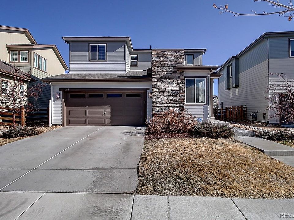 MOUNTAIN VIEWS! BEAUTIFUL 2-story, single-family home in sought-after Reunion! 3 Bedroom, 3 Bathroom home backs to Open Space and trails, and offers gorgeous views! Main level has wide-plank laminate wood flooring, private Study, and open floor plan between the Family Room, Dining Room, and Kitchen. Eat-in Kitchen features granite-slab countertops with beautiful dark cabinetry, stainless-steel appliances with gas range, and large center island with additional seating. Sliding door off Kitchen opens to big back yard with stamped concrete patio, fire pit, and, of course, the amazing view!! 3 Bedrooms upstairs, including the Master, which features Mountain View, private bathroom with dual sinks and ski dung barn door to big walk-in closet! Such a great home, and Reunion has everything! Walk to schools and numerous parks, walking distance to the Reunion Coffee Shop and Reunion Rec Center! Call now for your personal showing!