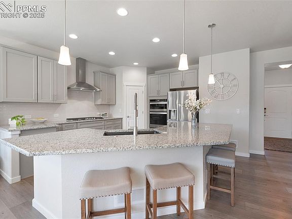 This gorgeous like-new ranch home in the desirable North Fork community offers spacious living, energy efficiency, and stylish design throughout. Set on a fully landscaped lot adjacent to open space, the home is equipped with solar panels and a car charger in the attached two-car garage. Inside, the light and airy open layout is enhanced by oversized windows and seamless flow between the kitchen, living room, and dining nook. The chef’s kitchen features ample gray Shaker cabinetry with elegant crown molding, granite countertops, stainless steel appliances, a 5-burner gas cooktop with a sleek stainless hood, and an expansive center eat-in island. The cozy living room centers around a stacked stone fireplace with a chunky wood mantel and opens through sliding glass doors to a large outdoor patio, perfect for entertaining or relaxing. The main level includes two bedrooms, including a luxurious primary retreat with its own private patio access and a stylish frosted glass sliding door leading to the spa-like en-suite bath. The primary bathroom boasts an oversized walk-in shower with a rain showerhead in addition to the two shower heads, and a generous bench seat. Three additional bedrooms are located in the finished basement, offering space for everyone, while the basement family room with wet bar is perfect for movie nights and gatherings. Energy-efficient solar panels help keep energy costs low! 2-car garage has an extra 4' of length over a standard garage, giving extra space for storage and outdoor gear. With thoughtful details throughout, and true move-in readiness, this home blends modern comfort with everyday convenience.