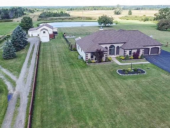 Welcome Home!! Spectacular sprawling ranch that sits on 5.56 acres with a stocked pond and 2 aerators, additional heated barn w/loft, two story shed & 2nd driveway to access these two buildings. Enjoy your summer evenings on the patio, screened in sun room or at the outdoor firepit enjoying the views. Partially fenced yard for all your fur babies will give you a peace of mind. As you wander inside you will be delighted with an eat-in kitchen, loads of beautiful white cabinets, formal dining room & a spacious living room with a brick fireplace that is WB or gas for chilly evenings. The master suite is the perfect getaway after a long day. Elegant features include dual basin sinks, bamboo accents, heated floors, deep whirlpool tub, & his & hers closets. 3 bedroom wing has a full bath with dual sinks, tub and walk-in shower. The 2.0 car heated attached garage has a room that is currently used as a workout room. If you love to camp, this home features a camper hook-up to cool your refrigerator before long camping trips. Hot water tank '21, furnace/AC '20, roof '12. You do not want to wait, this will not last. noon. Offers will be reviewed as they come in.