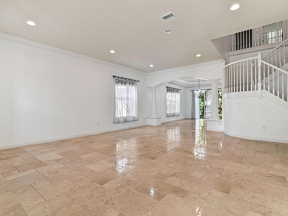 This home is a masterpiece of design and craftsmanship, boasting chiseled edge travertine marble flooring artfully laid in a captivating French pattern, complemented by the allure of Brazilian Cherry floors. Crown molding and high hat lighting elevate the ambiance to new heights, accentuating every architectural detail.