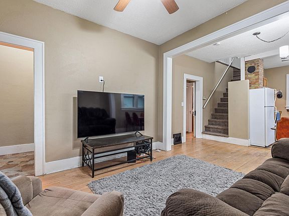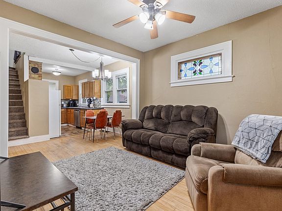 Perfect starter home or investment property near Horace Mann Elementary. A freshly painted covered front porch invites you into this cute home. The hardwood floors, a unique stained glass window, and high ceilings on the main floor provide a touch of the home's history. The main floor has two bedrooms and a full bathroom. The added space upstairs could be used as a 3rd bedroom, or make the perfect study space, game room, or playroom. The basement has 1/2 bathroom and additional flex space for a family room. The bonus room in the basement has been finished with recessed lighting and a walk-in closet. The home's exterior has metal siding for reduced maintenance. Two-stall garage with paved alley access has plenty of room for vehicles and storage. Plus there are two additional parking spaces next to the garage and one in front of the house for plenty of off-street parking.