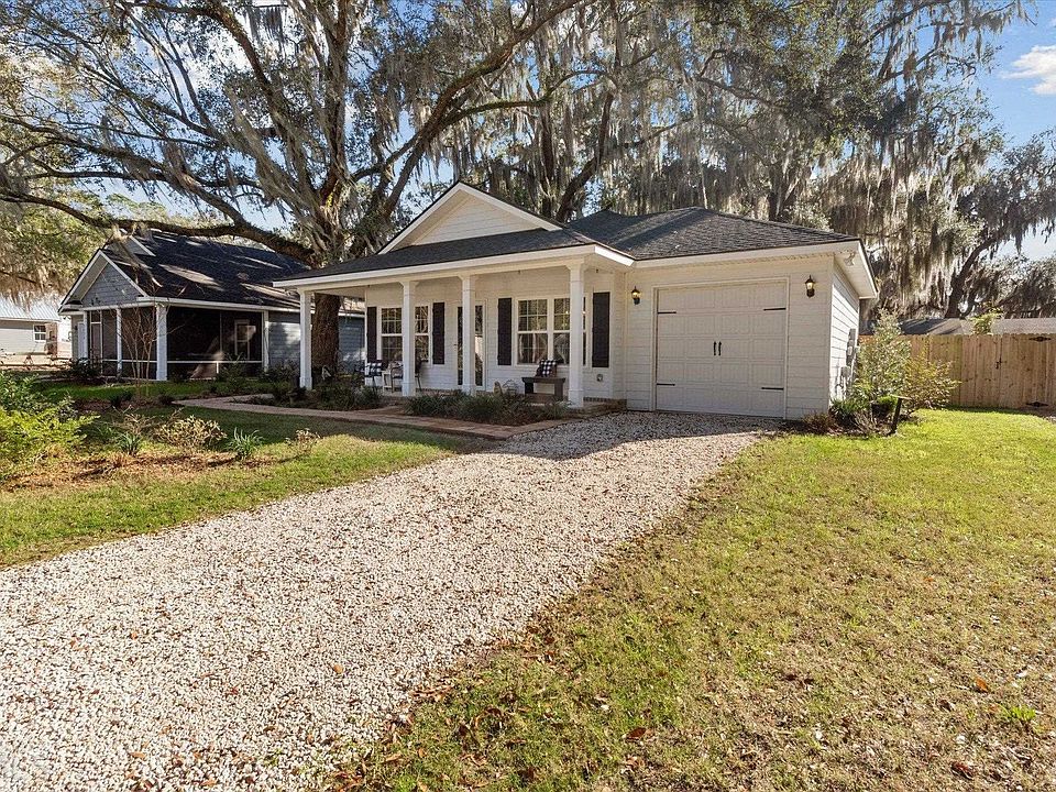 Charming coastal cottage located in Historic Downtown Darien and nestled underneath beautiful 150-300yr old oak trees displaying a beautiful canopy backdrop. Enter the front door and instantly notice the cozy open concept and upgrades such as, custom cabinetry, granite counter tops, and LVP flooring… Also, upgraded crown molding/trim, light fixtures, and stainless steel appliances. Very spacious master bedroom w/ensuite and expansive walk-in closet featuring custom built-ins. This home is immaculately cared for and just built in 2021 featuring complete water filtration/Softener system and spray foam insulation. Relax on the front porch or screened in back porch. Beautiful shaded backyard with privacy fence. Take a quick bike ride to the Historic Darien River Front for local dining spots, coffee shops, and boutiques. Walk to Fort King George State Historic Site. Easy commute to St. Simons Island and Jekyll Island. 1hr to Savannah. Here's your chance at a gem!