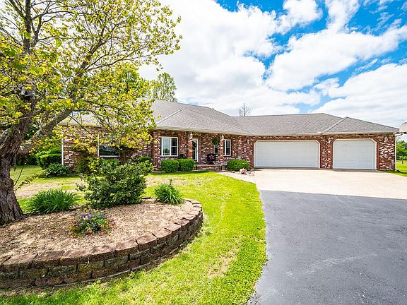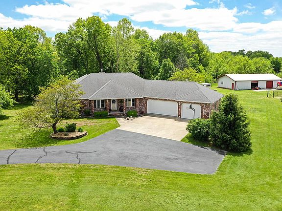 COUNTRY LIVING w/CITY CONVENIENCES.....THIS is the ONE you've been WAITING FOR!!! Incredible opportunity to own this ONE of a KIND property located just a stone's throw from Nixa's city limits on just under 10 acres at the end of a quiet, dead-end street, complete with 30'x60' horse barn/workshop, electric fenced pastures, riding arena AND in-ground POOL! This beautiful ALL BRICK home offers just over 2200 SF all on ONE level, with spacious rooms throughout, including three (3) BR's (could easily be 4), 2.5 BA's, a formal dining and an office! Key features include a lovely covered front porch, unique barrel wall entry, dramatic 9' ceilings and newer Pella windows and pull down shades throughout, brand new carpet in the living, dining and hallways and striking floor-to-ceiling brick wood burning fireplace in the living room. You will LOVE the impressive eat-in kitchen with beautiful granite countertops, hardwood flooring, center island w/electric cooktop, and the abundance of solid oak cabinetry and counter space it enjoys, complete w/pull up bar seating, built-in desk area and huge bay window overlooking your private backyard oasis. The spacious master suite offers its own patio access, his and her closets, dual sink vanity, step up jetted tub and custom tile walk-in shower. The well-appointed 30'x60' horse barn/workshop has it all, featuring three (3) (9' wide x 8.5' high) roll-up doors, convenient man door, concrete floors and steel truss construction, abundant lighting, water, PLUS a 16'x10' enclosed and heated office/tack room and 3 horse stalls! The attached 3-car garage is oversized and EXTRA deep (25') for those larger pickup trucks! You will delight in entertaining this Summer on the patio around your pool, complete with two (2) retractable awnings. BRING YOUR ANIMALS, this one is a MUST SEE!! DON'T WAIT, call TODAY for your private showing!