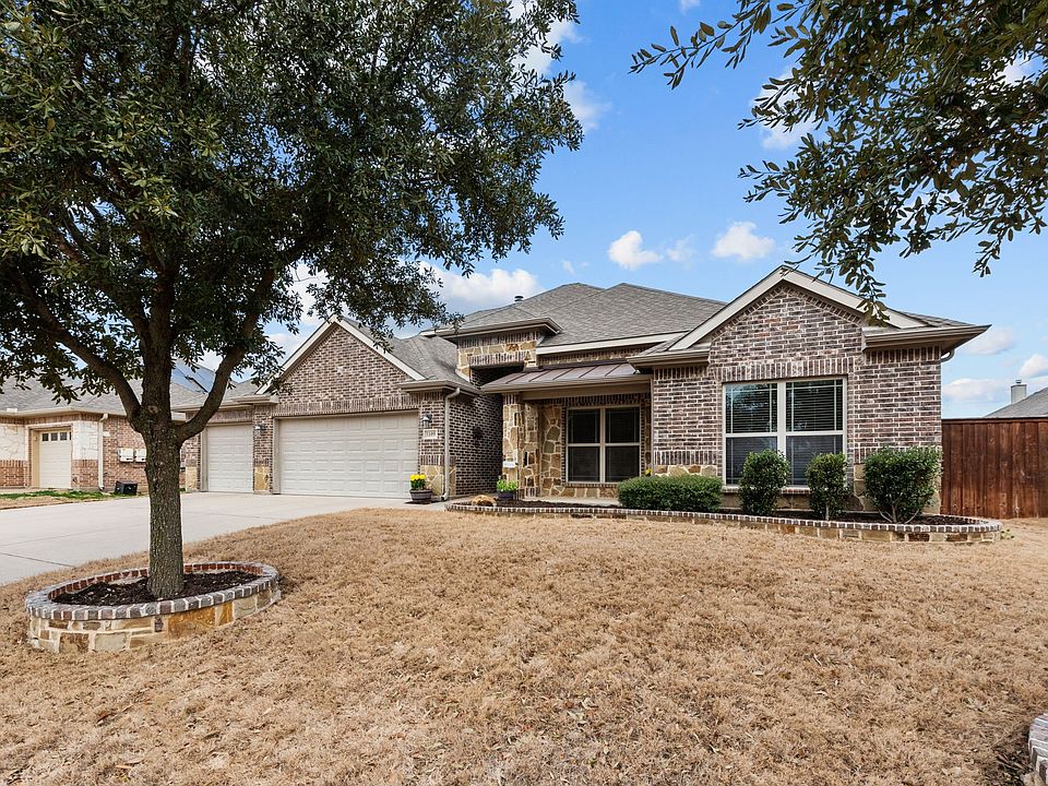 This 1.5 story home with stone and decorative brick facade offers four bedrooms with walk-in closets, two full and one half bathrooms, spacious living and dining areas a gourmet kitchen with one-level island-breakfast bar, granite countertops and stainless appliances; a second level game room, and three-car garage. Amenities include extensive hand-scraped hardwood floors, new 2023 carpet, modern lighting, new 2023 cool grey paint, new 2023 bathroom hardware, two new 2023 screen doors, all new 2023 toilets. Large private suite offers a spacious closet and spa-inspired bathroom. Relax and unwind under backyard covered patio overlooking a sparkling pool with a custom protective fence, or... enjoy community pool, park and waterways.