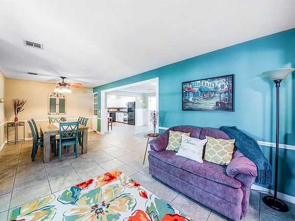 Wow! What an adorable home! The cute front porch provides a great impression for what is in store when you enter. This home has lots of light and a cozy environment with plenty of space for family and friends. All the common areas are beautifully tiled. The sitting area and adjoining dining room is welcoming and spacious. The kitchen is open with plenty of room for cooking and gathering. Off of the kitchen is a flexible space with a fireplace. This space is currently being used as a reading area. The flex space leads to a family room with lots of windows. There is plenty of light and space in this happy room! Off of the family room is a cute and welcoming patio with a space for a grill. On the west side of the home there are three nice sized bedrooms with newer carpeting. The hall bath has plenty of room and has been updated with subway tile, counters and fixtures. The master bathroom is at the south end of the hall and has a bathroom with a sink, toilet and shower. The owner has added an above ground storm shelter in the garage.