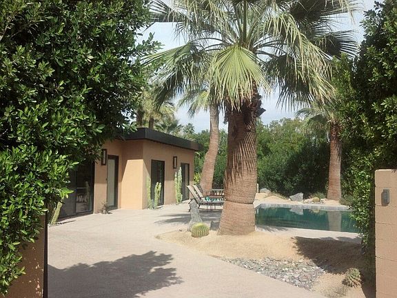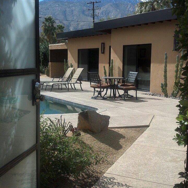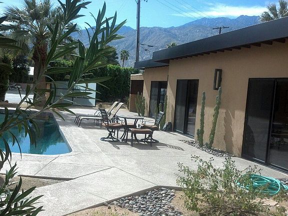 Situated diagonally on a corner lot, this mid century home enjoys plenty of space for a front-loaded pool, in addition to a backyard patio surrounded by a mature, professional landscaping. There are also stunning mountain views from nearly every angle. Having undergone a major remodel in 2012, this home feels and looks almost new. Smart renovations such as the restored metal kitchen cabinets with glass tile back splash, blend effortlessly with necessary updates for today's living. This includes features like travertine flooring, built-ins, new dual-pane windows and doors throughout, and beautiful updated baths.The home's layout notably features an open living and dining room, which connects to both the front and back yards via sliding doors. There's a convenient galley kitchen with laundry/utility room beyond. There are two bedrooms; the master is generously oversized, and was likely two bedrooms originally. It now comprises the entire end of the house and has an en suite bath.