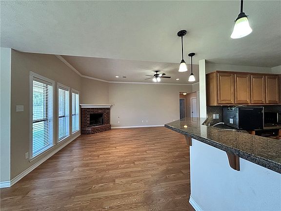 Brick fireplaceWood-finished flooringGranite countertopsSerene spaceWalk-in closetFront and back patiosDouble vanity